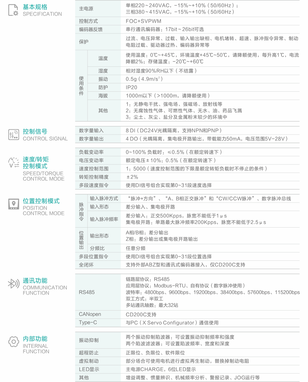CD200系列脈沖型伺服驅(qū)動器是四方電氣研制的一款通用型高性能交流伺服驅(qū)動器,支持Modbus、CANopen通訊協(xié)議,采用對應(yīng)的通訊接口,配合上位機可實現(xiàn)多臺伺服聯(lián)網(wǎng)運行。該系列搭載了最新的單參數(shù)自整定、1秒慣量測定功能、在線負載測定、在線共振抑制、末端振動抑制、多軸控制環(huán)同步等功能,使得伺服控制便捷易用。配合 CM10 系列高響應(yīng)伺服電機,運行可靠平穩(wěn),適用于包裝、食品生產(chǎn)、數(shù)控切割、紡織、機床、木工雕刻等典型行業(yè)的自動化設(shè)備,以高性能方案實現(xiàn)快速且精準(zhǔn)的位置控制,速度控制與轉(zhuǎn)矩控制。
