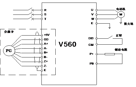 改造系統(tǒng)采用的方案為:高性能閉環(huán)矢量變頻器+分頻卡。系統(tǒng)方案中,變頻器配備分頻卡,使系統(tǒng)工作運(yùn)行在閉環(huán)矢量控制模式,實(shí)現(xiàn)變頻定位功能。因?yàn)樵谧詣?dòng)車床中,負(fù)載慣量大、減速時(shí)間短,需配備制動(dòng)電阻,具體選型方法《V560系列高性能矢量變頻器說明書》。