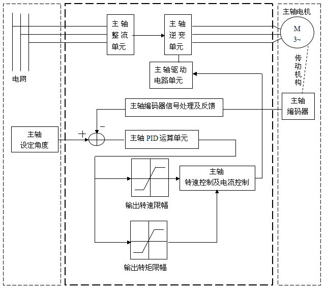 本方案整體控制框圖見下圖2。變頻器采用不控整流方式從三相電網(wǎng)取電,由三相逆變?nèi)珮蛲ㄟ^空間矢量調(diào)制(SVPWM)、閉環(huán)矢量控制(Field orientation control)實(shí)時(shí)控制主軸電機(jī);通過傳動(dòng)機(jī)構(gòu),將轉(zhuǎn)速信號(hào)反饋到變頻器控制單元,反饋的轉(zhuǎn)速信號(hào)通過分頻卡換算為角度信號(hào),與設(shè)定的角度做差,經(jīng)過PID單元運(yùn)算(加速過程PID,穩(wěn)態(tài)過程PID)得到下一拍主軸電機(jī)控制轉(zhuǎn)速指令(具有轉(zhuǎn)矩限幅功能), 從而實(shí)現(xiàn)主軸轉(zhuǎn)速、定位角度的實(shí)時(shí)精確控制。
