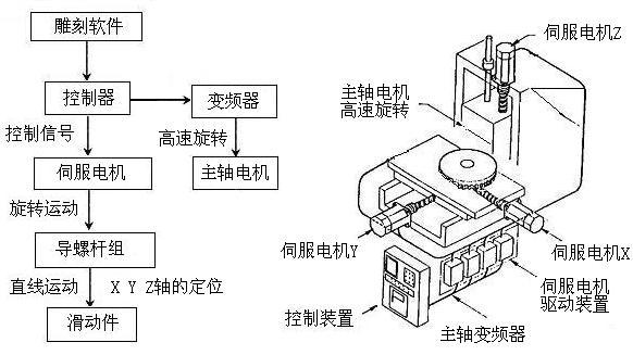 當(dāng)今主流數(shù)控雕刻機(jī)是由計(jì)算機(jī)、雕刻機(jī)控制器、雕刻機(jī)主體三部分組成,其工作原理是通過計(jì)算機(jī)內(nèi)配置的專用雕刻軟件進(jìn)行圖樣設(shè)計(jì)和排版,經(jīng)由計(jì)算機(jī)把設(shè)計(jì)與排版的信息傳送至雕刻機(jī)控制器中,再由控制器把這些信息轉(zhuǎn)化成能驅(qū)動(dòng)步進(jìn)電機(jī)或伺服電機(jī)的脈沖信號(hào),控制雕刻機(jī)主體上X、Y、Z三軸的雕刻走刀定位。同時(shí),控制器啟動(dòng)變頻器,帶動(dòng)主軸電機(jī)的雕刻頭高速旋轉(zhuǎn),對(duì)固定于主機(jī)工作臺(tái)上的加工材料進(jìn)行切削、鉆銑,即可雕刻出在計(jì)算機(jī)中設(shè)計(jì)的各種平面或立體的浮雕圖形及文字,實(shí)現(xiàn)雕刻自動(dòng)化作業(yè),按照不同的加工材質(zhì)和工藝要求,可以搭配不同的專用配置刀具。