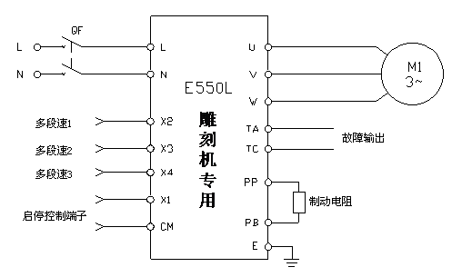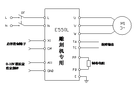 AI/GND接受控制器輸出的0~10V模擬量信號(hào),此電壓值與變頻器里參數(shù)設(shè)置的調(diào)速頻率范圍對(duì)應(yīng)成正比。X1/CM為變頻器正轉(zhuǎn)信號(hào),當(dāng)控制器發(fā)出正轉(zhuǎn)信號(hào),則控制器上的輸出繼電器動(dòng)作,繼電器的常開觸點(diǎn)吸合,提供信號(hào)給變頻器。L1、L2為變頻器的電源輸入,若變頻器選擇三相輸入,則連接在R、S、T端子上即可。TA/TC為變頻器繼電器輸出,通常選擇變頻器故障報(bào)警輸出,接入雕刻機(jī)控制器或者外部故障指示回路。