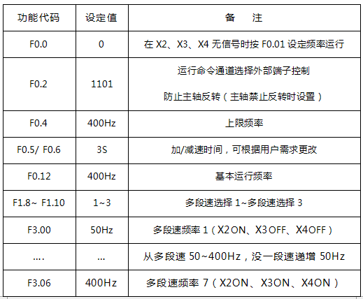 雕刻機(jī)專用變頻器固化了多段速給定方式參數(shù),默認(rèn)出廠值,無需設(shè)置,接線后便可使用,參數(shù)如下: