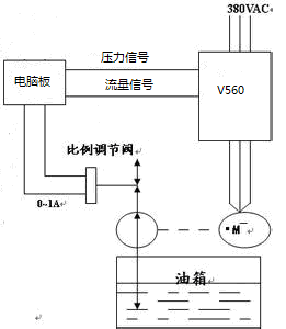 此方案將控制比例流量閥的電流/壓力信號同時輸入給變頻器的模擬量輸入端,通過控制油泵電機的轉(zhuǎn)速,油泵的實際流量正比于電機的轉(zhuǎn)速,油泵的功率因此也正比于電機的轉(zhuǎn)速,起到了節(jié)能的目的。其系統(tǒng)方案圖所圖1所示。根據(jù)塑料制品和工藝要求的不同,其節(jié)能效果從35%至70%的范圍內(nèi)不等。