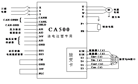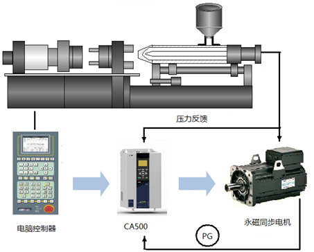 四方注塑機同步伺服油泵系統(tǒng)方案,以CA500系列重載型伺服驅(qū)動器為伺服電機控制平臺,搭配電液注塑伺服專用適配卡和旋變適配卡,與同步電機組成伺服閉環(huán)控制系統(tǒng)。