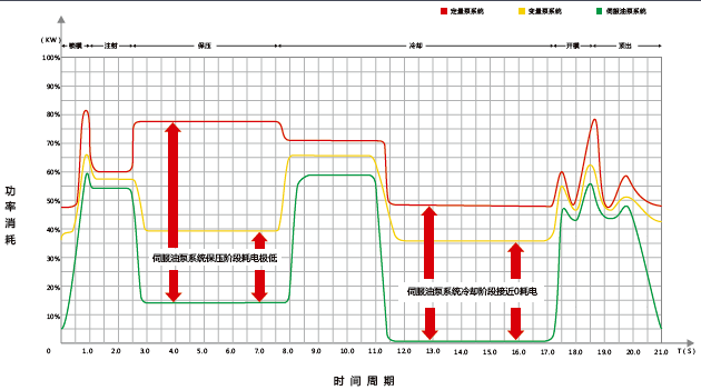 伺服驅(qū)動方案與普通變頻異步電機驅(qū)動方案相比,具有節(jié)能率高、效率高、成品率高等優(yōu)點。伺服驅(qū)動電機液壓能耗要比傳統(tǒng)注塑機節(jié)能40~90%,比變頻器改造注塑機節(jié)能20~50%。