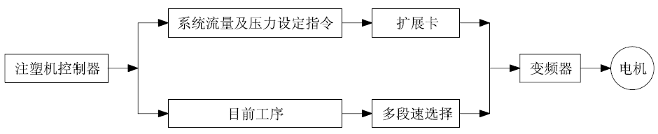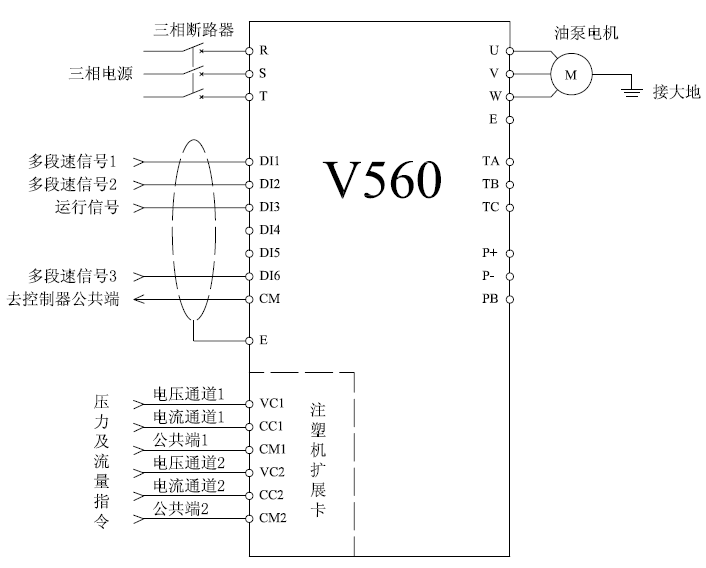 針對注塑機的成型工序及工藝特點,設(shè)計了四方V560系列變頻器搭載專用擴展卡的方案,系統(tǒng)構(gòu)成如圖1所示,具體如下: