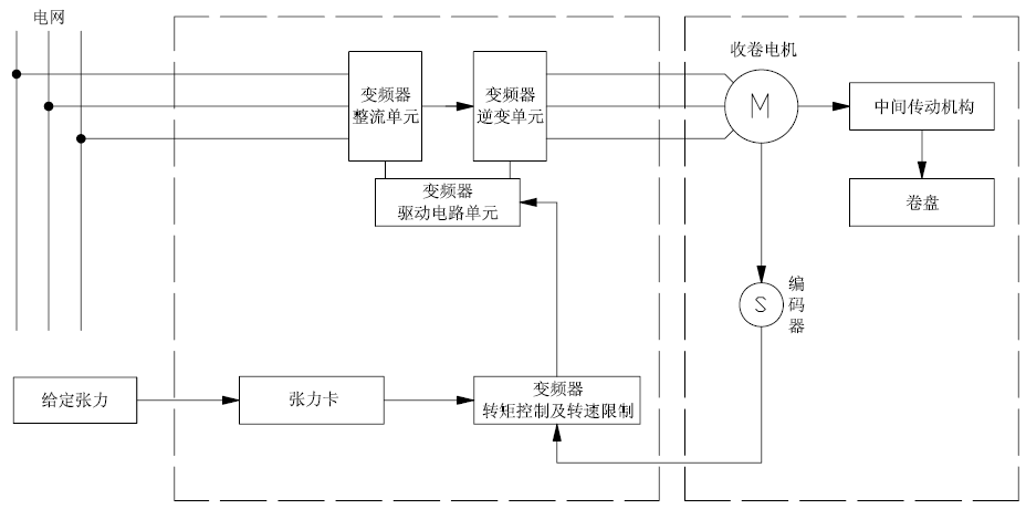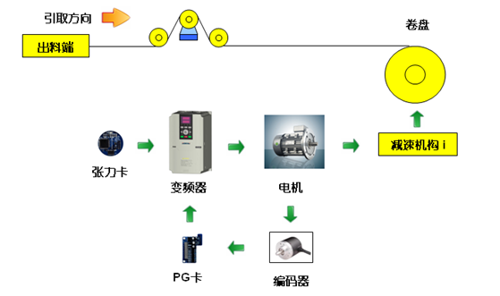 如下圖1所示,收卷的恒張力控制,是按照工藝將系統(tǒng)收卷所需的張力及空、滿盤卷徑設(shè)置到張力卡,張力卡根據(jù)運行線速度,計算出當(dāng)前卷徑,進而得到收卷所需的轉(zhuǎn)矩并將其給到變頻器,再由變頻器進行轉(zhuǎn)矩控制。在收卷過程中,系統(tǒng)可自動實時計算當(dāng)前的卷徑,以保證收卷張力的恒定。同時系統(tǒng)張力錐度的設(shè)置可使材料較好的卷曲成型。