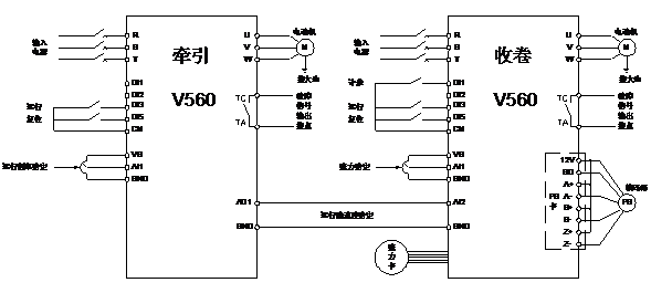 吹膜機是一種將塑料粒子加熱融化并吹成薄膜的設(shè)備,主要由吹膜和收卷兩部分組成。其中收卷部分的作用是將吹制出的薄膜卷取成卷,并使成卷的薄膜平整無皺紋, 卷邊整齊, 卷軸上的薄膜要松緊適中,以防止薄膜拉伸變形,保證質(zhì)量,因此收卷時必須采用恒張力控制。目前行業(yè)內(nèi)主要使用力矩電機來實現(xiàn)上述控制,但在使用過程中存在著需手動調(diào)節(jié),操作不方便,長時間運行時力矩電機發(fā)熱較高,其控制器較易損壞,可靠性不高的缺點。本文擬結(jié)合四方V560變頻器,介紹一種針對吹膜機收卷的恒張力控制系統(tǒng),在保證收卷工藝的同時可顯著提高設(shè)備的操作簡易性和可靠性。