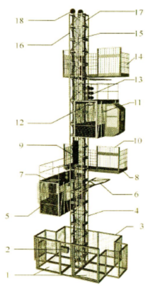 1—地面防護(hù)圍欄門;2—開關(guān)箱;3—地面防護(hù)欄;4—導(dǎo)軌架標(biāo)準(zhǔn)節(jié);5—吊籠門;6—附墻架;7—緊急逃離門;8—層站;9—對重;10—層門;11—吊籠;12—防墜安全器;13—傳動系統(tǒng);14—層站欄桿;15—對重導(dǎo)軌;16—導(dǎo)軌;17—齒條;18—天輪