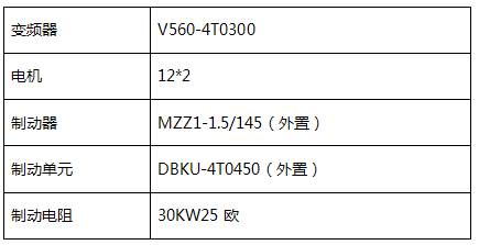 采用V560-4T0300一拖二的控制方式。(即V560-4T0300 采用V/F控制同時驅(qū)動2臺12KW的電機(jī)),系統(tǒng)外置電磁制動器,由變頻器控制制動器的松閘和抱閘信號。