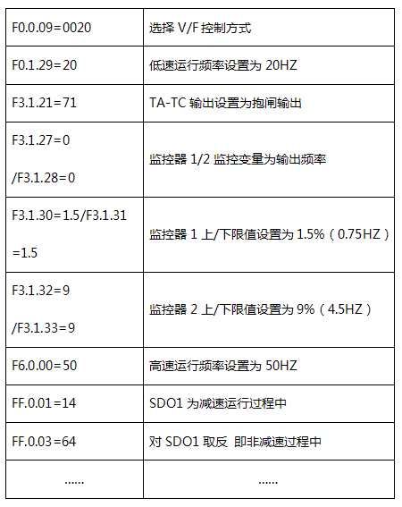 (3)設(shè)置松閘和抱閘頻率。設(shè)置原則是從高往低設(shè)置(一般是從8HZ以下),設(shè)置頻率需要平衡三個要素,第一個是松閘不溜鉤(即頻率不能設(shè)置太小);第二松閘或者抱閘瞬間電流不易太大(沖擊電流穩(wěn)定在1.5倍的額定電流以內(nèi)),這需要松閘抱閘頻率不易太大;第三個需要考慮啟動和抱閘的舒適性,這個要求抱閘或者松閘的頻率不宜過大。綜合這三個因數(shù)來匹配參數(shù)。