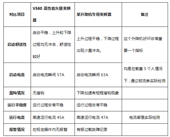 從現(xiàn)場對比情況來看,V560系列變頻器在升降機(jī)的啟動平穩(wěn)性、節(jié)能性以及安全運(yùn)行方面都是具有一定優(yōu)勢的。目前在全國各地使用幾十百余臺,反應(yīng)使用效果都常好,得到客戶的一致認(rèn)可。