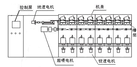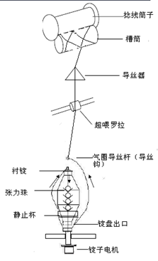 常見的倍捻機(jī)每個(gè)單元設(shè)計(jì)為8錠,前后兩面共16錠。每錠的工作原理如圖1 所示,當(dāng)錠子電機(jī)帶動(dòng)錠子轉(zhuǎn)動(dòng)的同時(shí),槽筒和捻絲筒在線速電機(jī)的帶動(dòng)下也同步轉(zhuǎn)動(dòng),從而使紗線從供絲筒子進(jìn)入張力管,穿過張力珠,被張力珠的彈性作用所壓緊,形成一個(gè)握持點(diǎn),紗線退離空心錠子的中心孔,垂直進(jìn)入錠盤,接著紗線由錠盤出口經(jīng)儲(chǔ)紗區(qū)偏轉(zhuǎn)到達(dá)靜止導(dǎo)紗鉤,并形成氣圈,氣圈的高度由導(dǎo)絲鉤的位置確定,紗線經(jīng)導(dǎo)紗鉤后,到達(dá)超喂羅拉,最后紗線經(jīng)過導(dǎo)紗器交叉卷繞在筒子上。