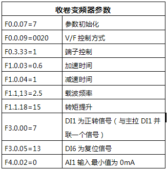 3.緊急停機不斷線。可以通過配合主拉緊急停機的時間和收卷啟動直流制動的頻率來控制。例如緊急停機斷線了,則需要增加主機的緊急停機時間或者適當(dāng)調(diào)大直流制動的起始頻率。
