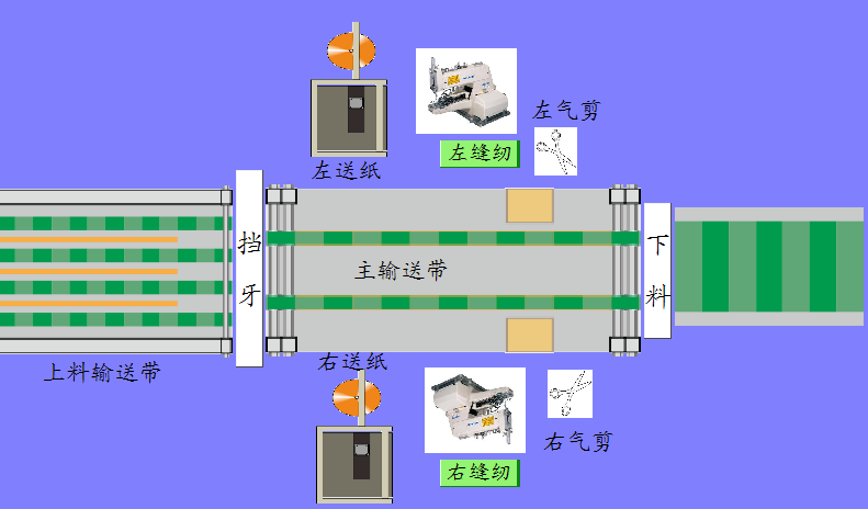 上料輸送帶 主輸送帶 左縫紉機(jī) 右縫紉機(jī)