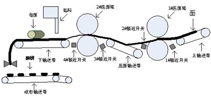 面皮經(jīng)過兩道壓面輪和捍面裝置的輾壓延展,使面皮更有光澤、品質(zhì)更加穩(wěn)定。每道壓面輪皆有厚薄調(diào)整裝置來設(shè)定面皮之厚度以增加或減少產(chǎn)品的重量;面皮在通過壓面輪與搟薄裝置間均由接近開關(guān)控制速度,使面皮不會因主機(jī)輸送速度過快而斷裂或過慢而阻塞;經(jīng)過最后一道主機(jī)壓面輪,面皮會落在主機(jī)輸送帶上,通過加餡部件加餡,再經(jīng)由卷輪及輔助卷輪將面皮卷成條狀;最后經(jīng)過捏花成型機(jī)成型,成型機(jī)可設(shè)定其切斷長度以決定產(chǎn)品的長度尺寸及重量大小,整個(gè)加工工藝如圖2。