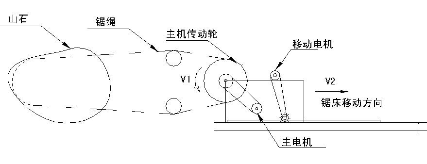金剛石繩鋸機是采用主電機帶動鋸繩沿近似跑道型的軌跡運行,鋸繩套在已經(jīng)鑿開縫的石頭山上,移動電機經(jīng)減速器帶動整個鋸床以一定的速度沿石頭被鋸開的方向向后移動。移動速度必須根據(jù)主電機的負荷狀況和鋸繩所需的張緊力適時進行調整,如果移動速度太快,主電機負載增大,甚至過載,鋸繩承受的張力也會增大,如不及時調整速度就會繃斷鋸繩。反之如果移動速度太慢,鋸繩張力太小,鋸繩會在石頭上打滑,切割效率降低,并且松馳的鋸繩還會打絞,以至絞斷鋸繩。所以在保證主電機負荷基本均勻和鋸繩合適的張緊力下提高鋸機切割效率是控制的關鍵,由于礦山形狀的不規(guī)則性,橫切面自然也時大時小,鋸床移動速度必須相應調整,整個加工工藝如圖2。