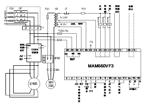 方案配置:C320K變頻器,普樂特MAM660VF3普樂特一體控制器(配CT相序檢測(cè)傳感器一套),NDK(BK)-150VA變壓器(輸入380V,輸出220V、20V),其他元?dú)廨o件和線材請(qǐng)參考下面配線圖。