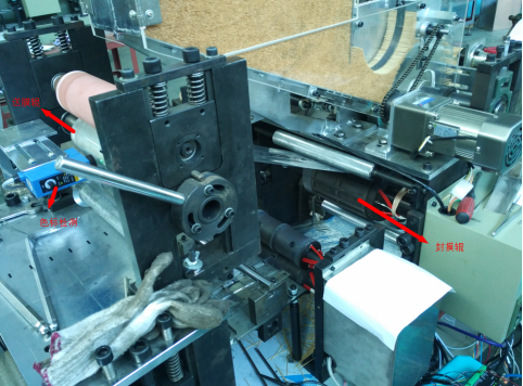 牙簽包裝機(jī)實(shí)物如圖2所示。膜通過(guò)送膜軸帶動(dòng)送膜輥旋轉(zhuǎn)送入封膜輥中,在初始位置有一個(gè)色標(biāo)傳感器,它通過(guò)與非色標(biāo)區(qū)相比較來(lái)檢測(cè)特定色標(biāo)或物體上的斑點(diǎn)。色標(biāo)傳感器實(shí)際是一種反向裝置,光源垂直于目標(biāo)物體安裝,而接收器與物體成銳角方向安裝,讓它只檢測(cè)來(lái)自目標(biāo)物體的散射光,從而避免傳感器直接接收反射光,并且可使光束聚焦很窄。其中,送膜輥和拉膜輥是同步相連,封膜輥和切刀輥是同步相連,從而簡(jiǎn)化了整個(gè)設(shè)備運(yùn)行的過(guò)程。