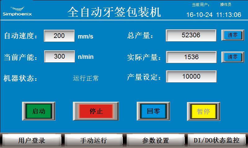 HMI主界面如圖5所示,可進(jìn)行產(chǎn)量的設(shè)定,并顯示設(shè)備的當(dāng)前運(yùn)行的速度、產(chǎn)能、產(chǎn)量、機(jī)械和報(bào)警狀態(tài)等信息。整個(gè)人機(jī)界面分配了兩級(jí)用戶,分別提供給終端用戶和設(shè)備廠家,二者各自有各自的登陸ID及密碼,在特定的界面中,不同級(jí)別的用戶享有不同權(quán)限的參數(shù)設(shè)置。