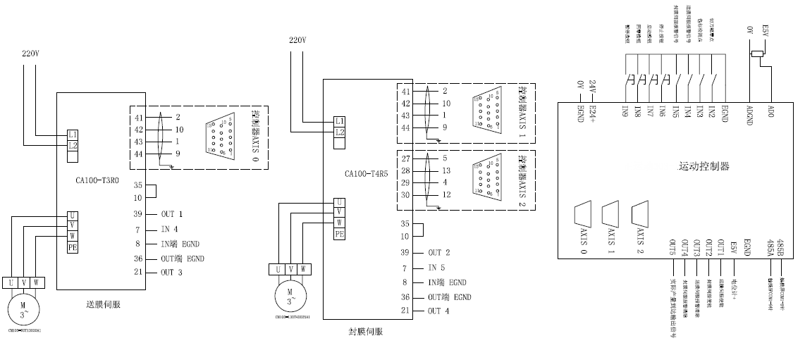 系統(tǒng)由傳統(tǒng)上下位機(jī)結(jié)構(gòu)組成,上位機(jī)由EM1-070E系列觸摸屏作為人機(jī)界面進(jìn)行設(shè)備操作、參數(shù)設(shè)定及顯示等功能。下位機(jī)是一臺(tái)運(yùn)動(dòng)控制器,完成自動(dòng)運(yùn)行過(guò)程中送膜軸和封膜軸的定位控制。執(zhí)行機(jī)構(gòu)由CA100系列伺服系統(tǒng)完成。