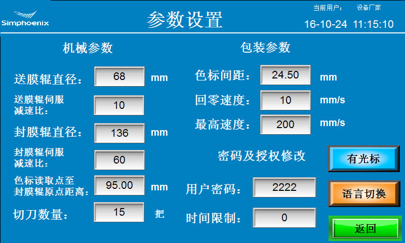 如圖6所示參數(shù)設(shè)定界面,所有用戶均可對(duì)機(jī)械及包裝參數(shù)進(jìn)行設(shè)定,滿足更多包裝的場(chǎng)合。設(shè)備的運(yùn)行方式及界面的語(yǔ)言均可以在此界面中進(jìn)行修改。