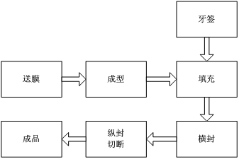 牙簽包裝機(jī)主要由送膜裝置、送料裝置、封膜裝置以及切割裝置構(gòu)成。其中送膜在設(shè)備的前后各有一部分,由送膜輥和送膜軸組成,主要負(fù)責(zé)把上下兩層包裝膜平整、均勻地送至封膜處,并與送料裝置送來(lái)的牙簽一起橫向封合。隨后在送至切割裝置進(jìn)行分包切割最后送至成品區(qū)。整個(gè)包裝的工藝流程如圖1所示。