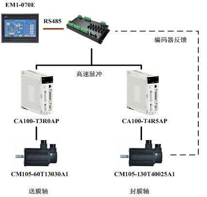 系統(tǒng)由傳統(tǒng)上下位機(jī)結(jié)構(gòu)組成,上位機(jī)由EM1-070E系列觸摸屏作為人機(jī)界面進(jìn)行設(shè)備操作、參數(shù)設(shè)定及顯示等功能。下位機(jī)是一臺(tái)運(yùn)動(dòng)控制器,完成自動(dòng)運(yùn)行過(guò)程中送膜軸和封膜軸的定位控制。執(zhí)行機(jī)構(gòu)由CA100系列伺服系統(tǒng)完成。