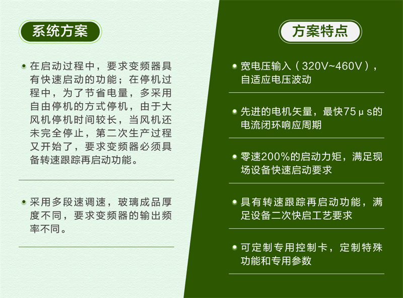 玻璃加熱后的冷卻分淬冷和緩冷兩個(gè)階段,對(duì)玻璃淬冷的基本要求是快速而均勻地冷卻,使玻璃外層呈壓力狀態(tài)而內(nèi)層呈張力狀態(tài)。冷卻速度愈快,溫度梯度愈大,產(chǎn)生的永久應(yīng)力,即鋼化應(yīng)力愈大,此時(shí)工藝要求風(fēng)量和風(fēng)壓必須在短時(shí)間內(nèi)迅速建立,充分冷卻達(dá)到鋼化效果。E580變頻器依靠其優(yōu)越的轉(zhuǎn)速跟蹤啟動(dòng)功能和低頻力矩等特性在江西某玻璃鋼化廠淬火冷卻風(fēng)機(jī)上成功運(yùn)用。
