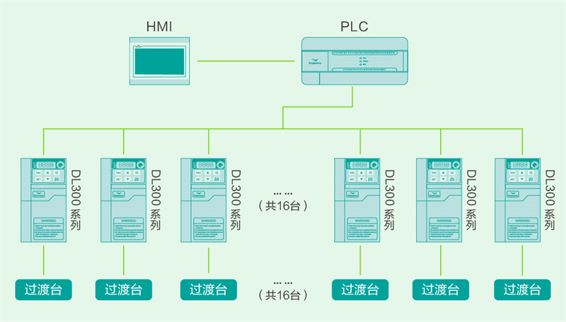 系統(tǒng)主要由HMI,PLC以及16臺(tái)DL300變頻器組成。輸送回轉(zhuǎn)臺(tái)由16個(gè)過渡臺(tái)構(gòu)成,過渡臺(tái)的運(yùn)行速度采用多段速控制方式,設(shè)定快速與慢速兩個(gè)調(diào)節(jié)檔位,到達(dá)特定工序段時(shí),通過光眼信號(hào)進(jìn)行段速切換,從而實(shí)現(xiàn)在清洗、磨邊等工序時(shí)慢速通過的要求。