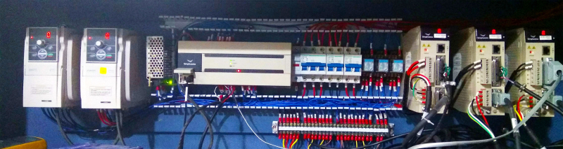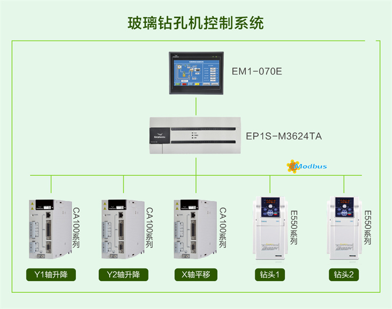 本方案采用2臺(tái)E550變頻器驅(qū)動(dòng)2個(gè)鉆頭主軸,變頻器通過標(biāo)準(zhǔn)Modbus rtu協(xié)議與PLC進(jìn)行通訊,變頻器的啟停、頻率都由PLC通訊給定,并通過通訊實(shí)時(shí)讀取變頻器輸出電流,檢知鉆頭磨損狀況。采用三臺(tái)CA100-T4R5AP系列伺服分別控制機(jī)器X軸左右平移和2個(gè)Y軸的上下升降。配備EMI-070E觸摸屏人機(jī)界面,用戶設(shè)置好參數(shù),一鍵自動(dòng)化完成玻璃鉆孔的整個(gè)工序流程。