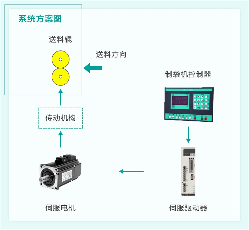 送料機(jī)構(gòu)的系統(tǒng)控制主要由制袋機(jī)控制器、伺服驅(qū)動(dòng)器(CD100-T3R0PC)、伺服電機(jī)(CM10-A80T02430B3GM3)、送料傳動(dòng)機(jī)構(gòu)等構(gòu)成?;竟ぷ髟頌椋篊D100伺服驅(qū)動(dòng)器驅(qū)動(dòng)CM10伺服電機(jī),并通過同步帶帶動(dòng)送料輥送料。制袋機(jī)控制器負(fù)責(zé)伺服位置脈沖信號(hào)的發(fā)送及系統(tǒng)其它控制信號(hào)的轉(zhuǎn)化和傳遞。切刀每運(yùn)動(dòng)一次,控制器就發(fā)送脈沖控制伺服電機(jī)運(yùn)轉(zhuǎn),脈沖的個(gè)數(shù)及頻率決定了伺服電機(jī)轉(zhuǎn)動(dòng)的圈數(shù)(即送料長(zhǎng)度)和送料的速度。
