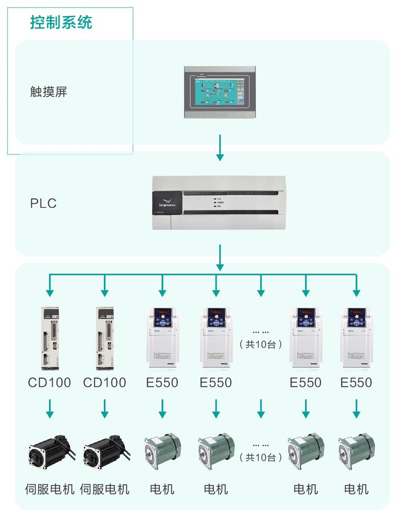 本系統(tǒng)主要由HMI、PLC、2套CA100伺服驅(qū)動(dòng)器以及10臺(tái)E550變頻器組成。