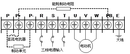 大功率變頻器(E380-4T0150、V560-4T0220以上)沒有內(nèi)置制動(dòng)單元,因此制動(dòng)電阻無法接到變頻器功率端子上,只能外接在制動(dòng)單元P和PB端子。