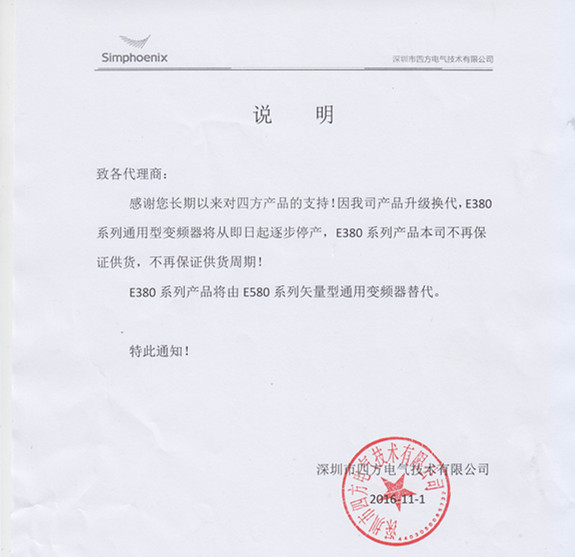 因我司產(chǎn)品升級換代,E380系列通用型變頻器將從即日起逐步停產(chǎn)。