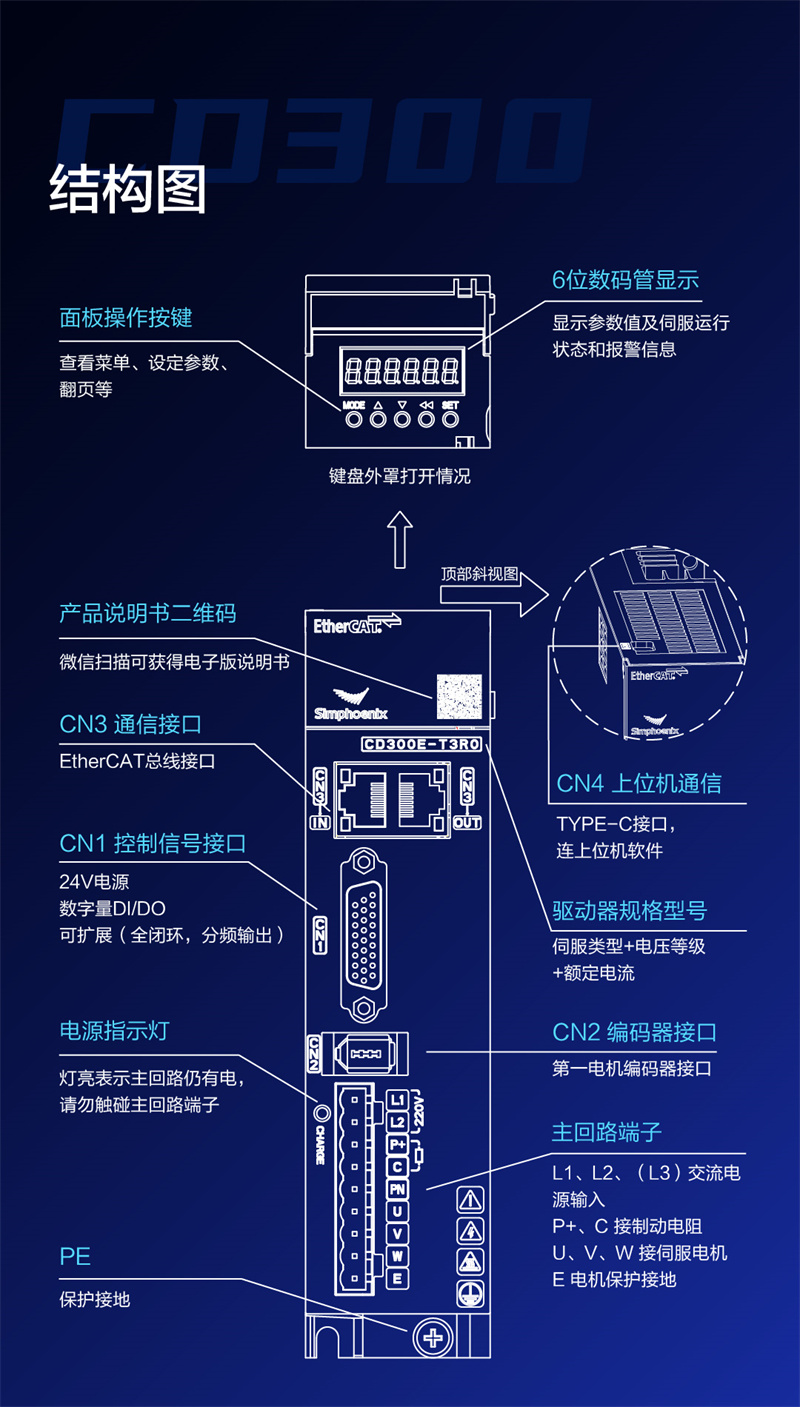 依托二十余年在伺服控制領(lǐng)域的沉淀,四方電氣創(chuàng)新性地將自主智能控制算法與EtherCAT總線通信技術(shù)深度融合,成功打造出CD300E系列高性能伺服驅(qū)動(dòng)器。