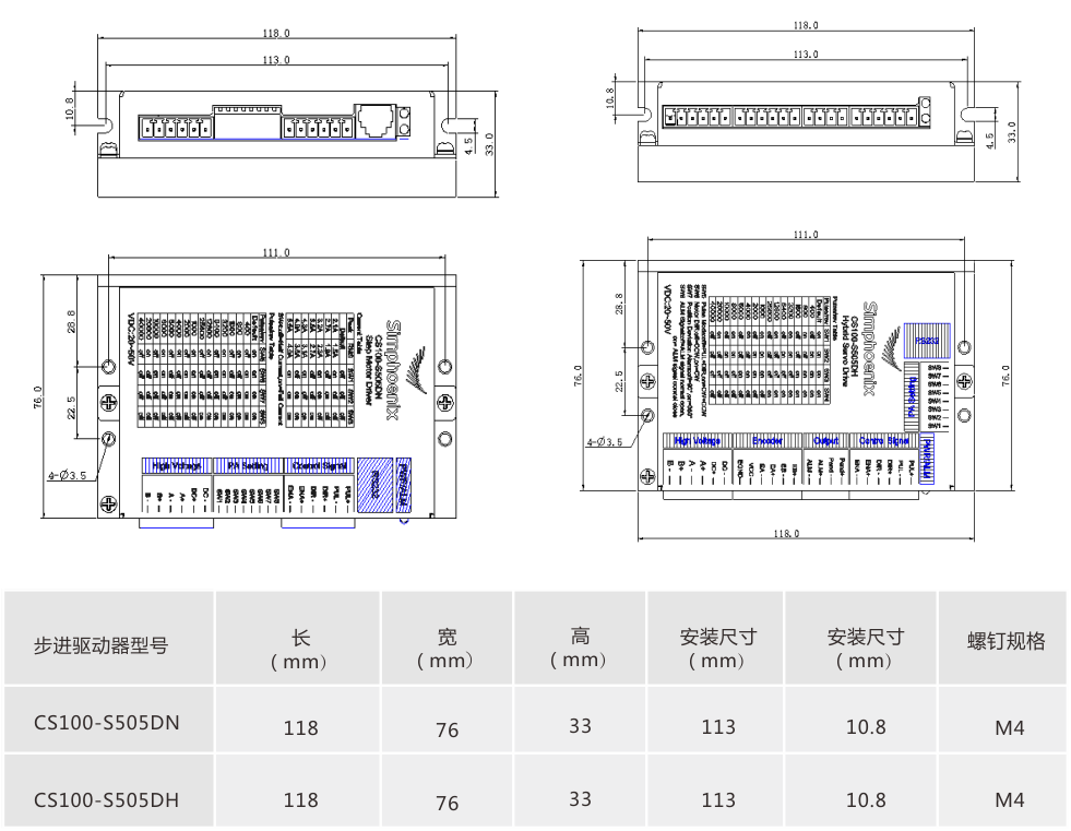 CS100-S505DN/CS100-S505DH是深圳市四方電氣技術(shù)有限公司結(jié)合多年變頻器與伺服驅(qū)動(dòng)產(chǎn)品開(kāi)發(fā)經(jīng)驗(yàn),開(kāi)發(fā)的一款新型數(shù)字式步進(jìn)驅(qū)動(dòng)器,選用了新一代電機(jī)控制專(zhuān)用32位ARM芯片,量身優(yōu)化的電流PID控制技術(shù),可使電機(jī)能在極低細(xì)分條件下平穩(wěn)安靜運(yùn)行,同時(shí)平滑而精確的電流控制技術(shù)能顯著提高電機(jī)的性能、減少發(fā)熱和振動(dòng),從而提升應(yīng)用器械的加工速度、精度,優(yōu)化能耗等設(shè)備性能。該驅(qū)動(dòng)器適配:電流≤4.0A,外徑尺寸為57、60和86系列兩相步進(jìn)電機(jī),可無(wú)縫替換現(xiàn)有開(kāi)環(huán)、閉環(huán)步進(jìn)系統(tǒng)。