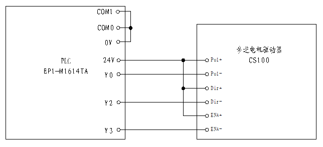 Y0輸出高速脈沖,Y2控制方向,Y3控制使能;使用PLC的24V電源,無需加電阻限流。
